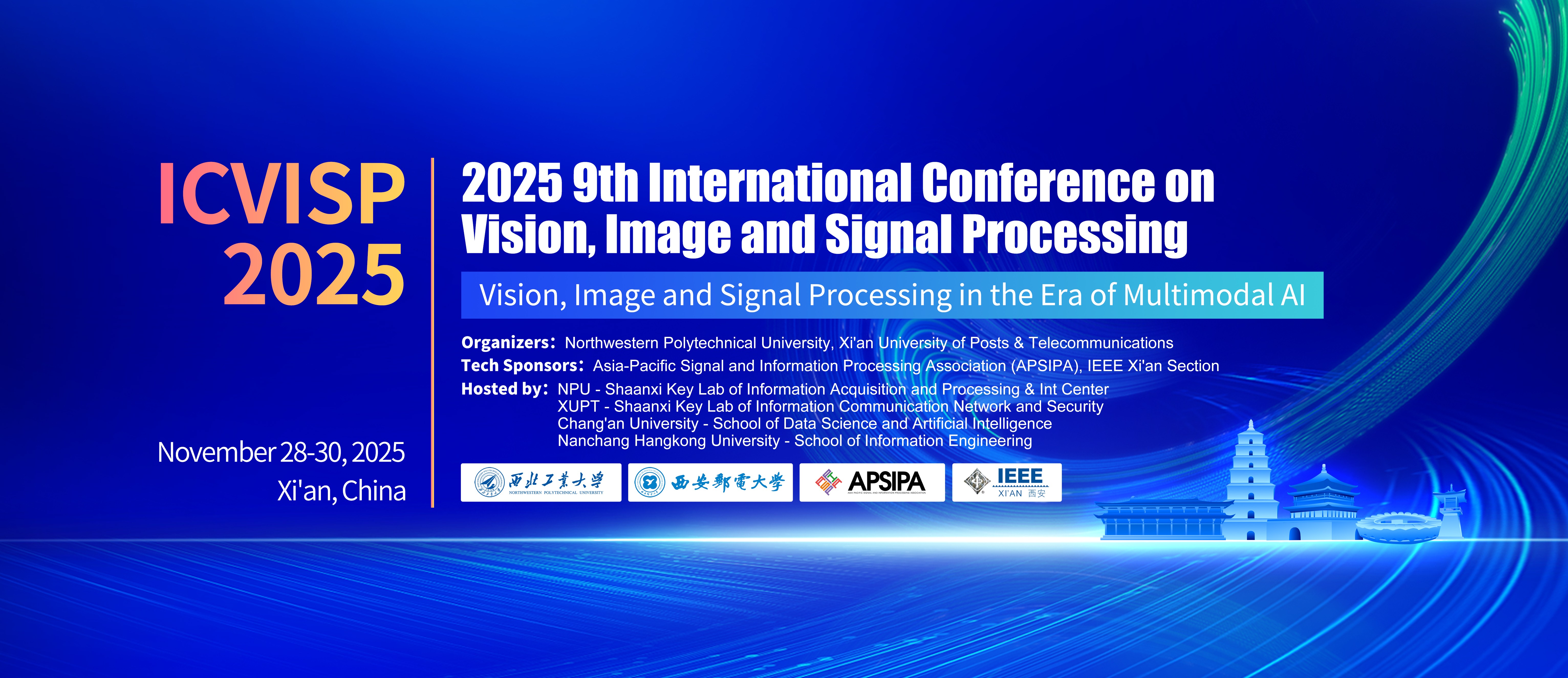 It is with great pleasure that we invite you to the 2025 9th International Conference on Vision, Image and Signal Processing (ICVISP 2025), which is scheduled to take place from November 28-30, 2025, in Xi'an, China. The conference is sponsored by Northwestern Polytechnical University and Xi'an University of Posts & Telecommunications, and technically sponsored by Asia-Pacific Signal and Information Processing Association (APSIPA) and IEEE Xi'an Section. ICVISP is committed to delivering a platform for collaboration and discovery, with the aim of driving progress in image, vision, and signal processing—key technologies that are enhancing our understanding of the world and propelling advancements in artificial intelligence, machine learning, and a multitude of other applications that are transforming industries and improving lives. We warmly invite your contributions and eagerly anticipate the opportunity to meet with you in person at ICVISP 2025.