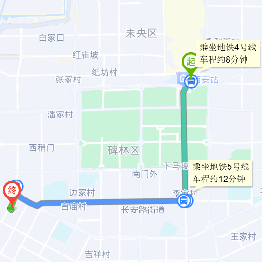 17.3 km away from the venue, around 31 minutes drive. 距离会场17.3千米,驾车约31分钟。 | Walk approximately 2 kilometers to Xiliuying Station, then take Subway Line 16 to Huanlegu Station (around 6 minutes) and transfer to Subway Line 5 to Fengqing Gongyuan Station (26 minutes), then walk approximately 990 meters. 步行约2千米至细柳营站,乘地铁16号线至欢乐谷站(约6分钟),换乘地铁5号线至丰庆公园站(约26分钟),再步行约990米。 |
